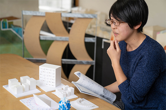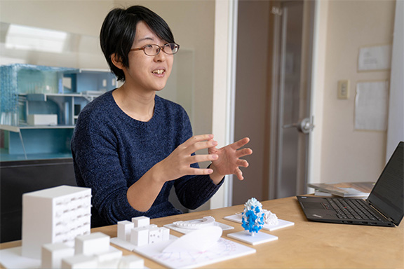 このコーナーでは、環境情報学研究科で学び研究した先輩たちが、どのように大学院で過ごして,社会に出て活躍しているかをお届け致します。第1回は都市生活学専攻の大沼美朝子さんです。大沼さんは、特定の条件を基にルールをつくり、その解析に従ってデザインを行うアルゴリズミックデザインの手法を研究に取り入れました。特にユニークなのは、粘菌の生態を観察し、粘菌の成長面での特徴をルールとして建築デザインに取り入れたことです。まさしく自然を建築のルールにする。それを標榜したユニークな研究を行っていました。